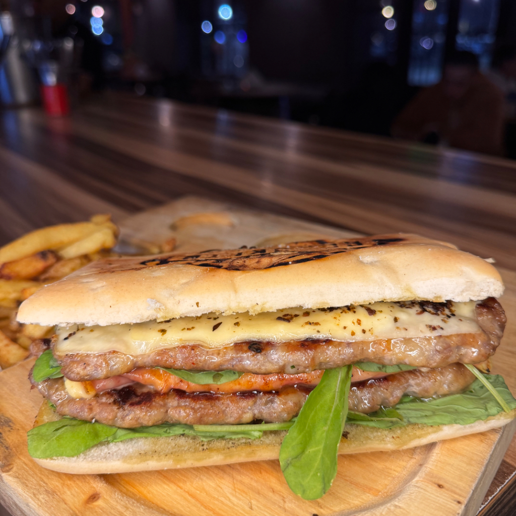 DOBLE BLEND DE POLLO AHUMADO - PAN INTEGRAL DE MOLDE CON SEMILLAS - CEBOLLA CARAMELIZADA - QUESO PORT SALUD - PASTA DE PALTA - QUESO CREMA LIGHT - INCLUYE FRITAS ESPECIALES