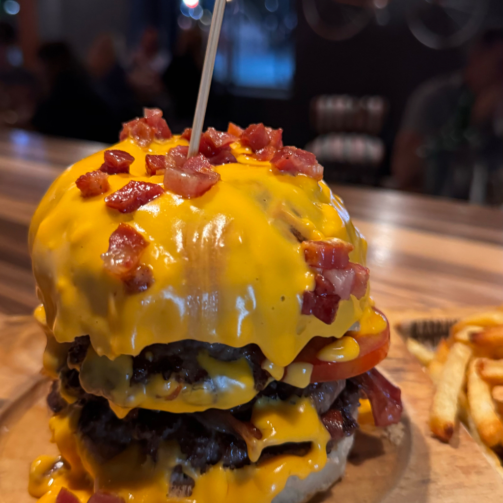 🍗 Medallón casero de pollo de 170gr empanado en cereal, frito al estilo KFC 🧀 Cheddar fundido 🥓 Panceta crocante 🧅 Lluvia de cebolla picada 🥫 Barbacoa bien sabrosa